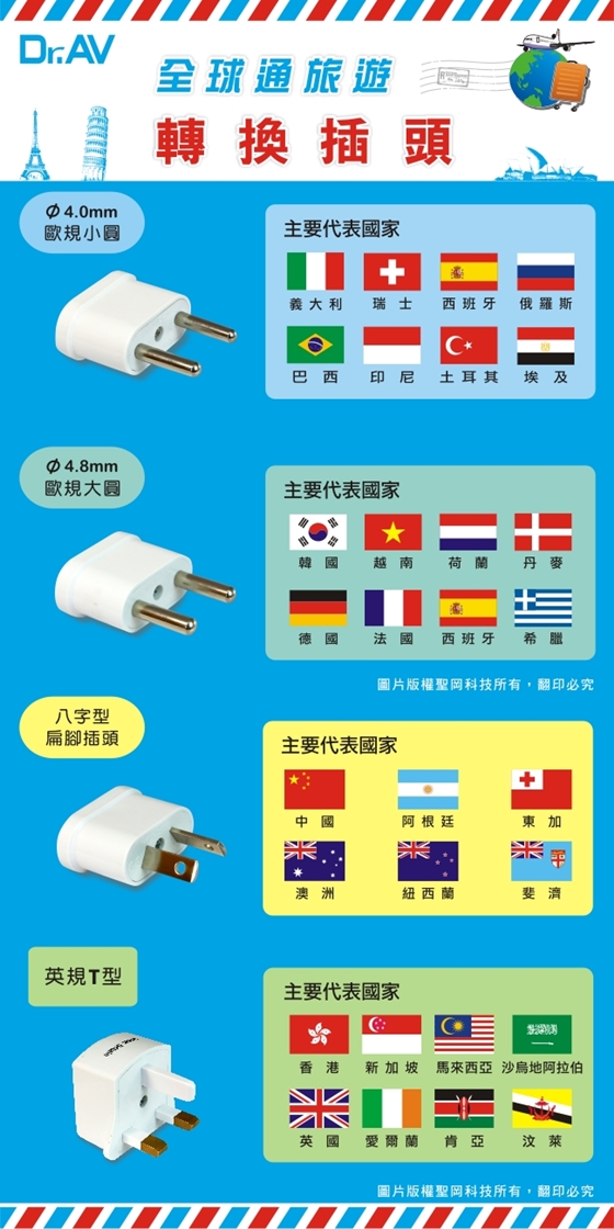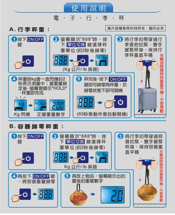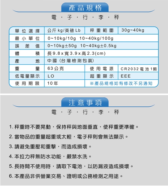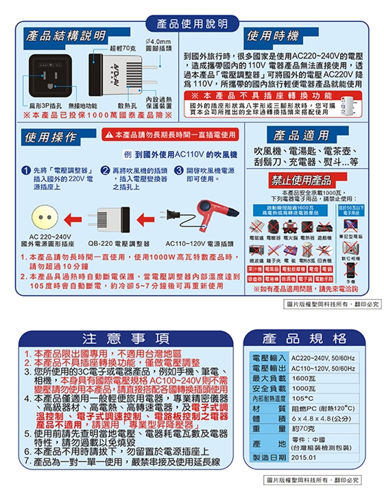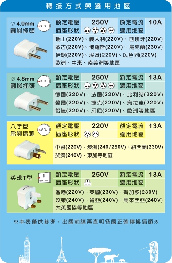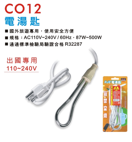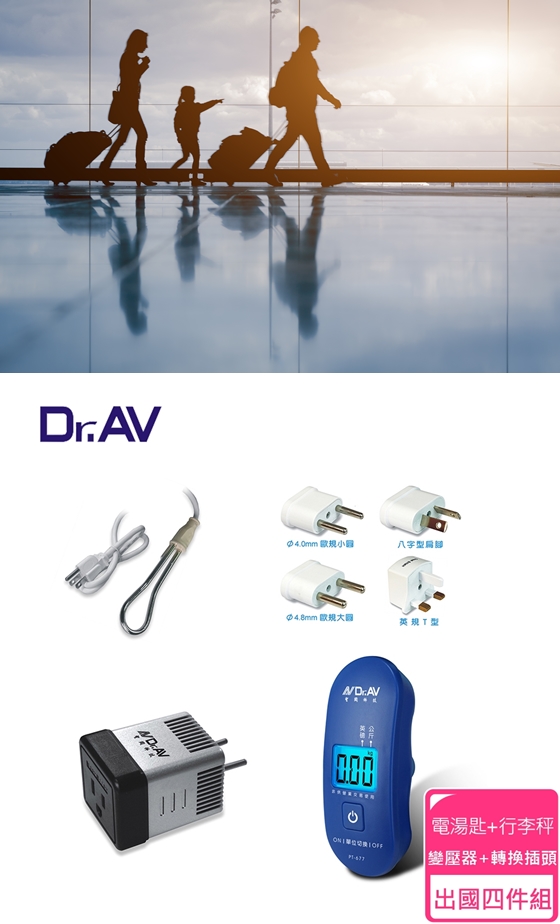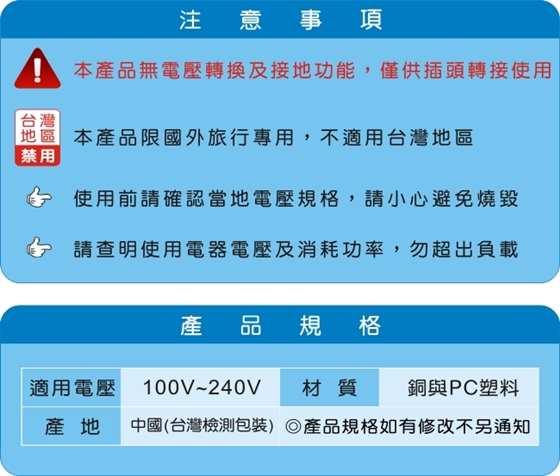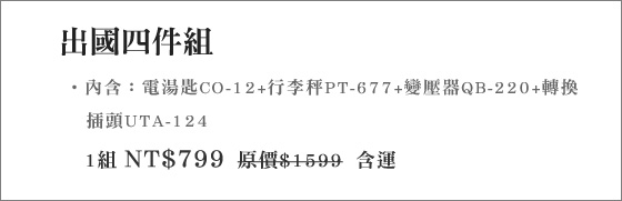 | 一整組一次完整配套 國外旅遊專用,使用安全方便!  電湯匙CO-12使用方法 1.須使用耐熱容器,使用時先將耐熱容器盛水。 2.將電湯匙金屬部份浸入水中,並將手柄上的掛勾,掛在容器邊緣。 3.最大及最小浸沒深度: ※最大浸沒深度以手柄底部為限。 ※最小浸沒深度以掛鉤底部為限。4.電湯匙浸人水中後,再插入電源使用。 5.水燒開後,須先拔除電源插頭再將電湯匙取出。由於此時電湯匙金屬部份仍然很熱,不可接觸或放置於易燃物上,以避免危險建議立即冷水沖洗或放置安全陰涼處降溫後擦乾置妥即可。 行李秤PT-677✰四種單位切換 ✰自動鎖定LOCK重量功能 ✰容器扣重歸零 ✰非供營業交易使用    變壓器QB-220▶安全負載1000瓦特 ▶體積小方便攜帶,操作簡單 ▶台灣第一個具過熱自動斷電保護 ▶外殼PC材質耐熱120度 ▶本產品己投保3000萬產品責任險  轉換插頭UTA-124♘詳細各國插頭對照 ♘四種常用插頭 ♘適用電壓250V/10A     商品規格電湯匙CO-12 尺寸(產品本身):長12×寬3.5(公分);電線長-87公分;加熱部長-7.5公分 尺寸(外盒包裝):長19.5×寬10×高5.5(公分) 電壓:100~240V/87~500W/60Hz 防水:符合防水等級IPX7 材質:銅、耐熱塑膠 重量:170公克 數量:1入 產地:中國(台灣監製) 電檢字號:R32287 注意事項 1.容器必須為耐熱器皿。 2.請勿燒煮黏稠食物。 3.使用中、使用後未降溫前,請勿以手直接碰觸高溫電熱管表面。 4.電湯匙絕不可無水空燒,不使用時必需將電源插頭拔除。 5.產品插電及使用中需有人在場,並避免孩童使用及碰觸。 6.此為消耗品,無法維修。 7.為防止故障及損害,請勿將電線纏繞於電湯匙上。 8.本產品具有安全保護裝置,若電湯匙在電源線插頭未拔掉時,離開水面,保險絲即自動燒毀造成斷電,雖過程無任何險,但產品將無法再使用。 9.電源線無法更換,電源線損壞時此電器必須丟棄。 10.本產品不可以外加計時器或個別遙控方法來預約開啟。行李秤PT-677 單位選擇:公斤kg/英鎊lb 秤重範圍:30g~40Kg 秤重最小單位範圍:0~10kg/10g,10~40Kg/100g 誤差值:0~10kg±50g 10~40kg±0.5kg 體積:長9.8x寬3.9x高2.3公分CM 產地:中國(台灣檢測包裝) 重量:63公克 使用電源:CR2032電池1顆(內附) 低電量顯示:LO 超重顯示:EEE 使用年限:10年 注意事項 ※秤重時不要晃動,保持秤與地面垂直,使秤重更精準。 ※當物品的重量超重或太輕,電子秤則無法顯示。 ※要以手持吊繩來秤重,勿拿本體。 ※請避免重壓與重擊,而造成損壞。 ※本拉力秤無防水功能,嚴禁水洗。 ※請使用碳鋅電池,勿使用鹼性電池。 ※長時間不使用時,請取下電池,以防漏液造成損壞。 ※本產品非提供營業交易、證明或公務檢測之用途。變壓器QB-220 電壓輸入:AC220~240V,50/60Hz 電壓輸出:AC110~120V,50/60Hz 最大負載:1600瓦 安全負載:1000瓦 內部耐熱溫度:105℃ 材質:阻燃PC(耐熱120℃) 體積:6.5x5.5x4(公分) 重量:約95公克 產地:中國(台灣檢測組裝,品質保證) 注意事項 ※本產品限出國專用,不適用台灣地區。 ※本產品不具插座轉換功能,僅做電壓調整,國外的插座形狀為八字或三角形狀,可參考本公司UTA系列全球轉換插頭搭配使用,購買前請特別注意。 ※本產品請勿長時間一直使用,使用1000W以上高瓦特數產品時,請勿超過10分鐘。 ※本產品具過時自動斷電保護,當電壓調整器內部溫度達到105度時會自動斷電,約冷卻5~7分鐘後可再重新使用。 ※低於50瓦以下電子商品,不建議使用。 ※您所使用的3C電子或電器產品,例如手機、筆電、相機、相機,本身具有國際電壓規格AC100~240V則不需變壓請勿使用本產品,請直接搭配各國轉換插頭使用即可。 ※本產品僅適用一般輕便旅行用電器,專業精密儀器、高級器材、高電熱、高轉速電器,及電子式調溫控制、電子式調速控制、電路板及控制之電器產品不適用,請選用「專業型升降壓器」。(可參考本公司GTC變壓器系列)。 ※使用前請先查明當地電壓、電器耗電瓦數及電器特性,請勿過載以免燒毀。 ※本產品不用時請拔下,勿留置於電源插座上。 ※產品為一對一單一使用,嚴禁串接及使用延長線。 ※規格若有修改不另通知。轉換插頭UTA-124 額定電壓:250V/10A 材質:塑料PC、銅 體積:長16x寬7x厚4CM 重量:約75g 產地:中國(台灣檢測包裝,品質保證) 注意事項 ※本產品限國外旅行專用 ※使用前先查明當地電壓規格 ※再查明欲使用電器電壓及消耗瓦數,勿超出附負。 ※本產品無電壓轉換及接地設計,請小心避免燒毀。(可購買Dr.AV QB-1600 220V轉110V 電壓調整器)本產品最大負載2200瓦特,安全負載1650瓦 ※規格若有修改不另通知。 | 詳細商品說明 | ※其他推薦※
