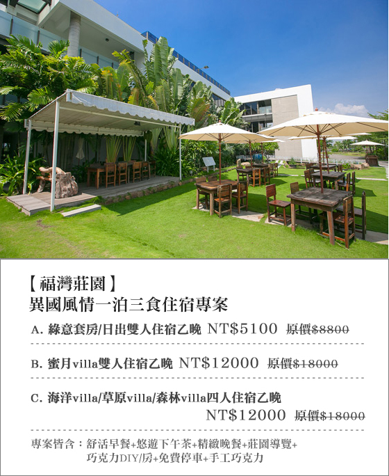 | 福灣莊園-異國風情一泊三食住宿專案-食尚玩家、媒體強推!世界級綠建築,品嚐無菜單式在地創意料理,體驗Villa不用出國也能享受!只要5100元起即可享有【福灣莊園】原價最高18000元異國風情一泊三食 售價:5100