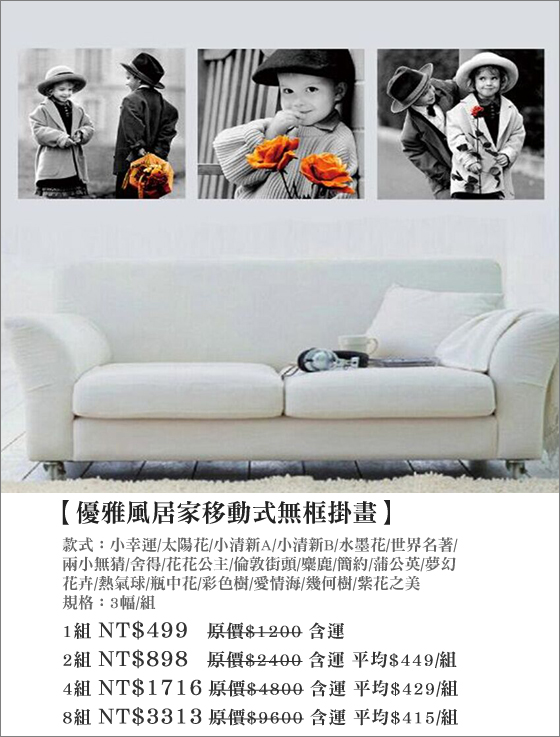 我有去遍尋各大購物網站momo購物、yahoo奇摩購物、博客來、PChome線上購物、ibon mart搜尋優惠價格!CHARLES最近也對這個商品很感興趣,售價隨時會調整;特價有時效性,有需要的人動作要快!網路價格隨時會調整,請以原網購平台資料為準!因為我自己也想要了解優雅風居家移動式無框掛畫,所以到處尋找資訊做功課. |  | 優雅風居家移動式無框掛畫-居家美學再提升!客廳、臥室等情境塑造,無須釘牆即可安裝,還可隨時移動或更換圖樣,變換家中氛圍超簡單!平均每組最低只要415元起(含運)即可享有優雅風居家移動式無框掛畫1組/2 售價:415